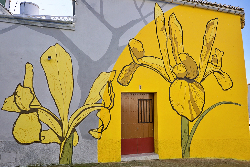 Al fondo, la flor de lirio amarillo, emblema de la Reserva de la Biosfera Tajo-Internacional.